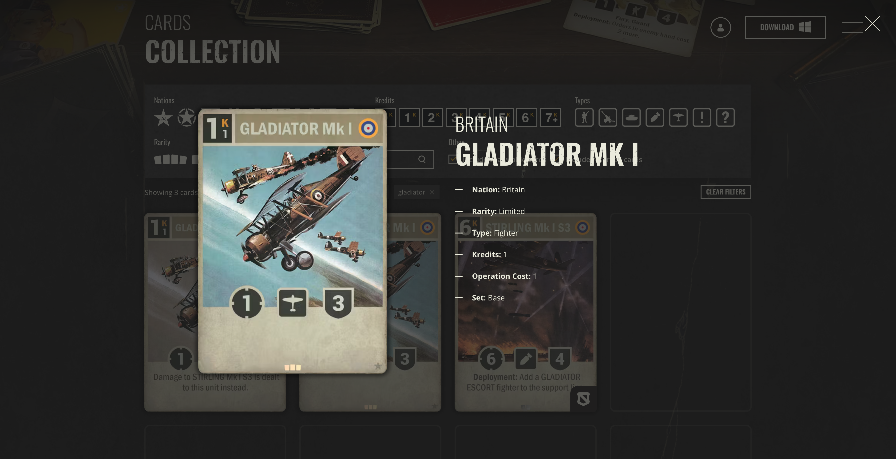 Kards cards: “Gladiator Mk I” (角斗士战斗机第一代). Gloster Gladiator is a type of British biplane fighter in early WWII. Gloster is the company, Mk means mark, i.e. version or generation.