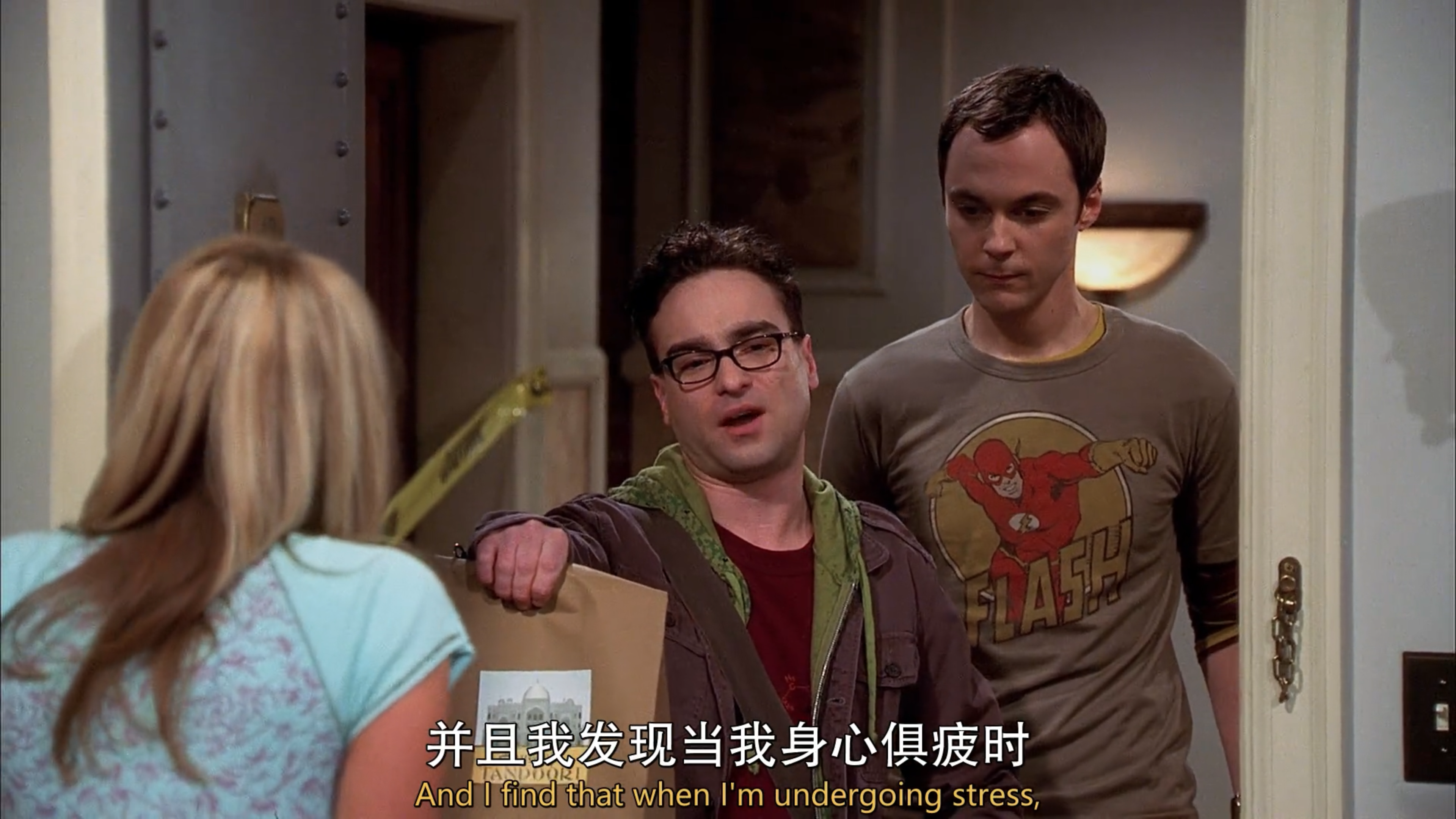 Leonard: Anyway, um. We brought home Indian food. And, um. I know that moving can be stressful, and I find that when I’m undergoing stress, that good food and company can have a comforting effect. Also, curry is a natural laxative, and I don’t have to tell you that, uh, a clean colon is just one less thing to worry about.
