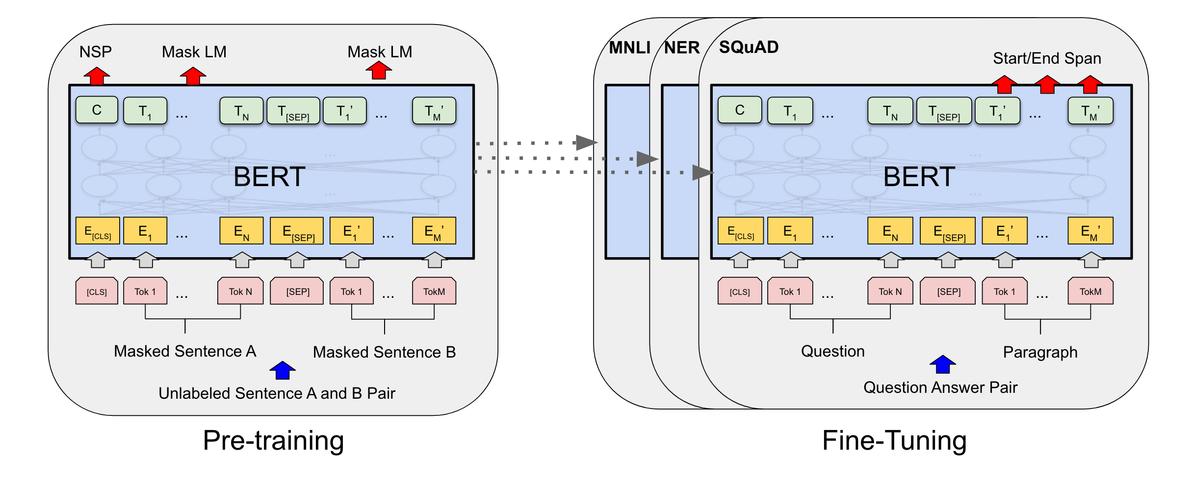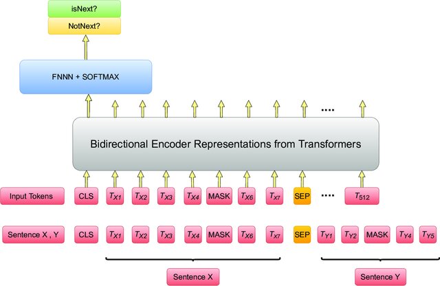[MASK]), and train BERT to predict the masked tokens based on the surrounding context. This allows BERT to learn bidirectional context representations. - Next Sentence Prediction (NSP): Given two sentences, train BERT to predict whether the second sentence follows the first one in the original text. This helps BERT understand the relationship between sentences.