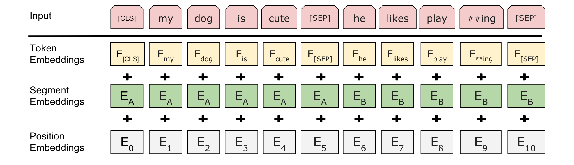 - Input Embeddings: BERT adds additional segment embeddings on top of the token embeddings and position encodings. (Position encodings are also called position embeddings in BERT.)