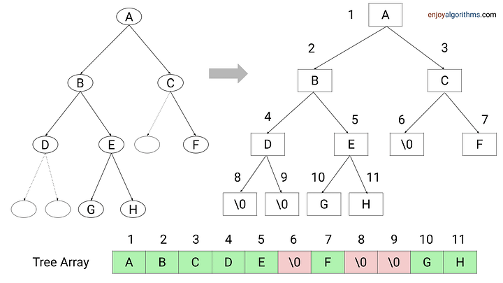 The binary tree can also be represented using an array, where the root node is stored at index 0, and for any node at index i, its left child is stored at index 2i + 1 and its right child is stored at index 2i + 2. This array representation is particularly useful for complete binary trees, where all levels are fully filled except possibly for the last level, which is filled from left to right. This is called array-based binary tree.