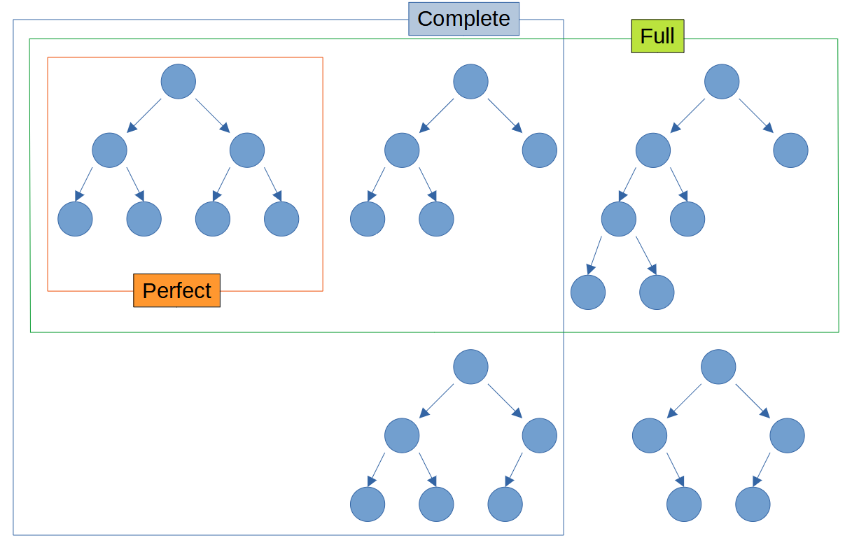 - Full binary tree: Every node has 0 or 2 children.