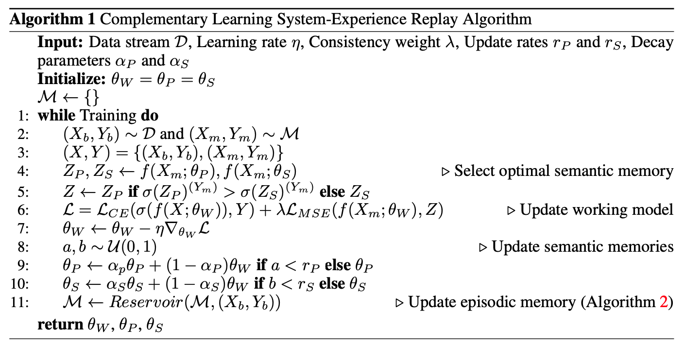 此方法的快慢网络是独立于主网络的两套网络,且二者是并列关系。这就是一个基于知识蒸馏的重演方法,特殊在知识蒸馏参考的网络有两个——快慢网络,训练时根据每个 batch 的具体情况选择其中一者加到蒸馏损失中(选择的方法可以是实用主义的,哪个效果好选哪个),蒸馏损失用于防止遗忘。在主网络一步更新后,快慢网络也要更新,用的是一种蒸馏网络的方法:exponential moving average(EMA)。