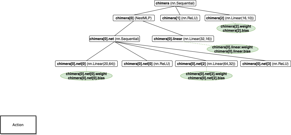 模型的参数应该是模型的一个属性。上图是笔记(三) NestMLP 的参数图(它与笔记(三)图的区别在于,有参数的层外挂了一个绿色的叶子结点)。可以看到参数放在了模型的 weight、bias 属性中。